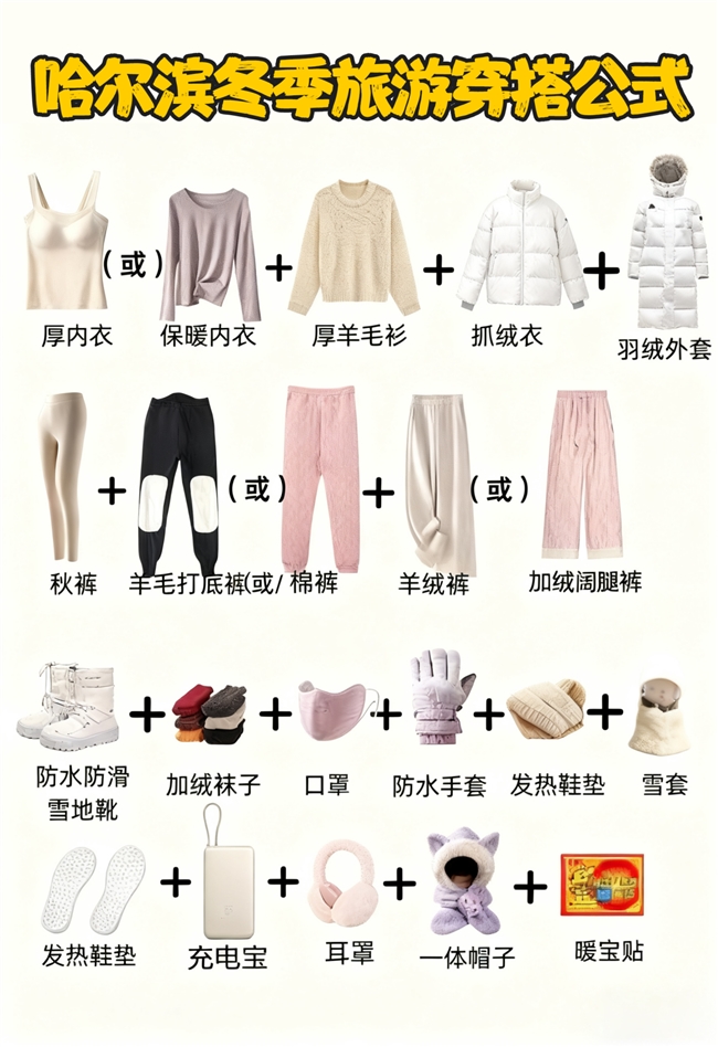 内层穿速干衣,吸汗又保暖;中层穿抓绒衣或者厚毛衣,锁住热量;外层一定要穿防风的长款厚羽绒服,把身体裹得严严实实,冷风进不来!下身记得穿保暖裤+羽绒棉裤,两条裤子叠穿,腿不冷才舒服。